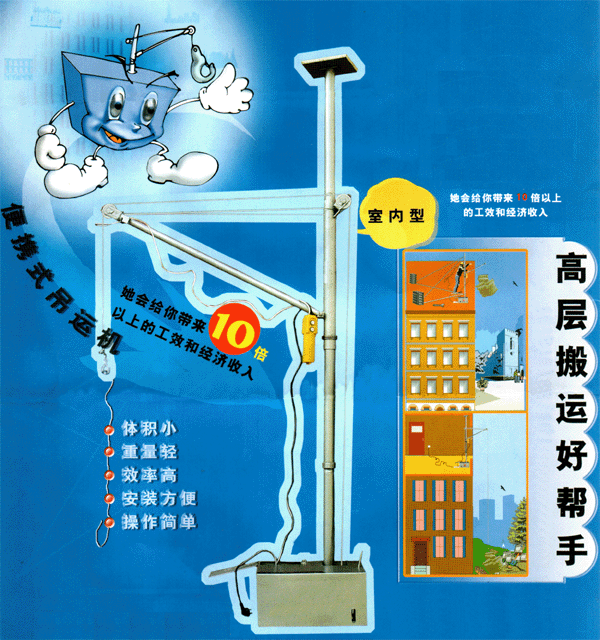 便攜式小吊機(jī)是誕生于世紀(jì)之初的新產(chǎn)品,它體積小、重量輕,一個(gè)人自行車就能攜帶;它吊的高、速度快,30層樓房8分鐘就能打來(lái)回;它便于安裝、起重大、容易操作、效率高;它投資小、見(jiàn)效快、零風(fēng)險(xiǎn)、高回報(bào)它的問(wèn)世是當(dāng)今建筑裝潢行業(yè)機(jī)械運(yùn)料的重大突破,從此將結(jié)束高空裝潢材料依靠人工搬運(yùn)的歷史。它極大地減輕了勞動(dòng)強(qiáng)度,最大地創(chuàng)造了經(jīng)濟(jì)效益。